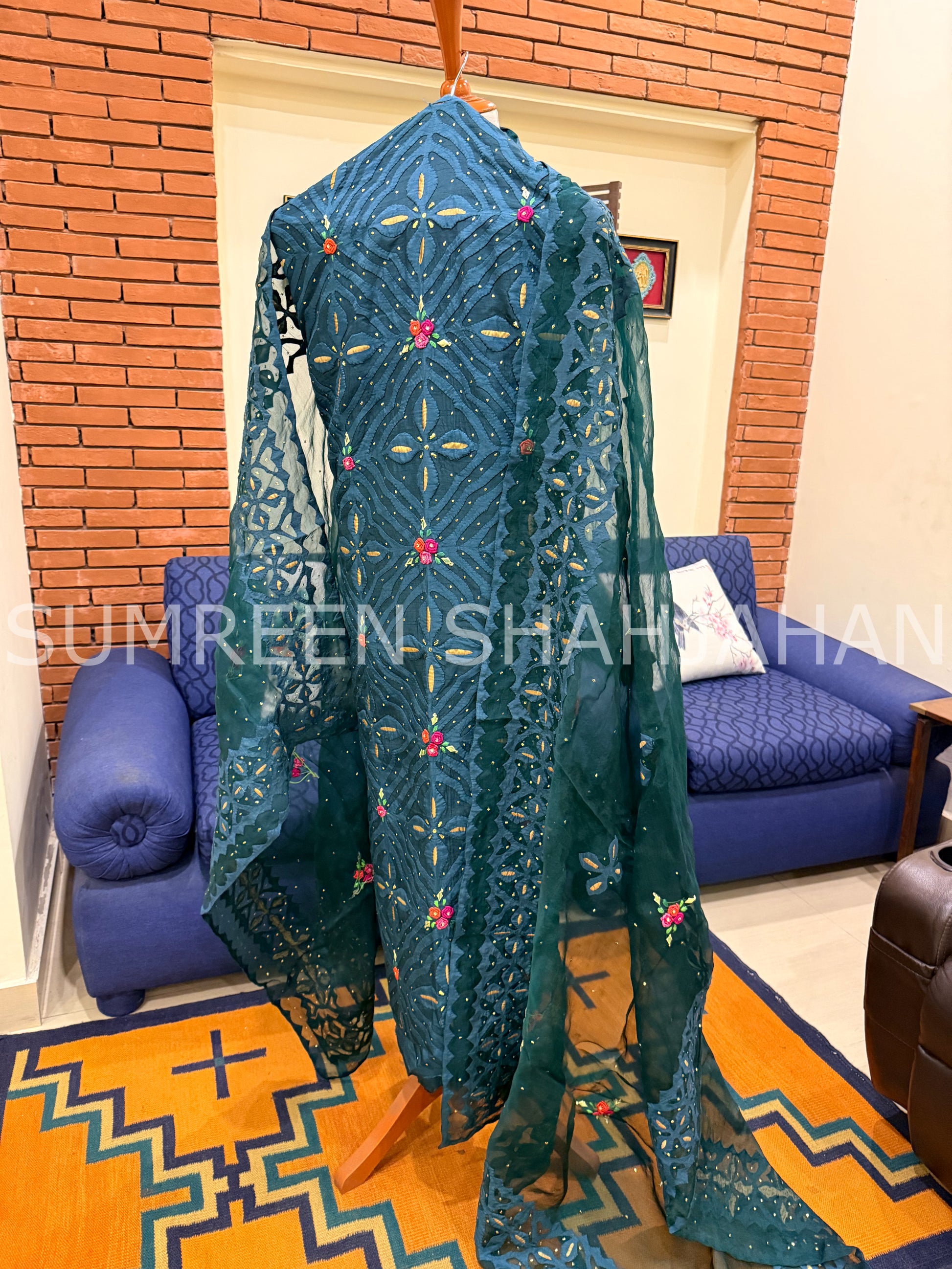 Bottle Green with Roses Ralli - 3 Piece Unstitched Set
